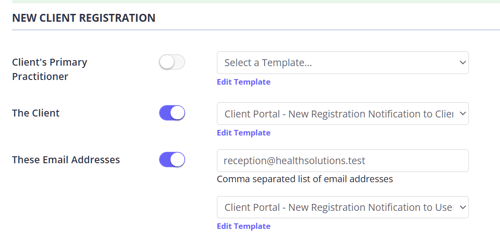 - For each client portal event (New Client Registration, Appointment Booking, Appointment Cancellation, and Waitlist Request), there are three types of recipients you can configure: the practitioner, the client, and additional email addresses. This ensures the right people are always informed.