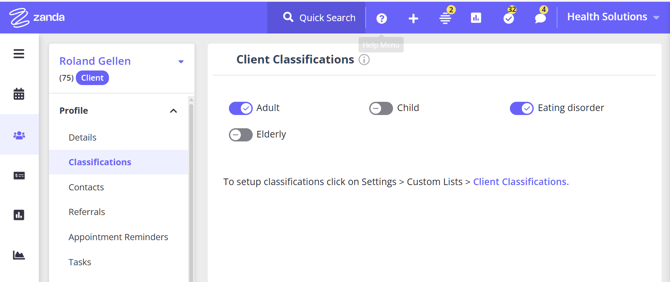 3. From the available classifications, turn on the ones you want for that client (multiple classifications can be selected).