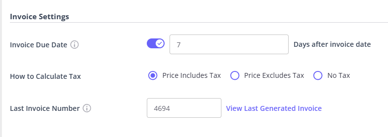 There are three settings available:- Price Includes Tax: By choosing this option, the tax will be a part of the invoice's final amount. For example, if a service you're selling costs $100, then a $10 tax will be displayed as part of the $100, meaning the final amount will still show up as $100.