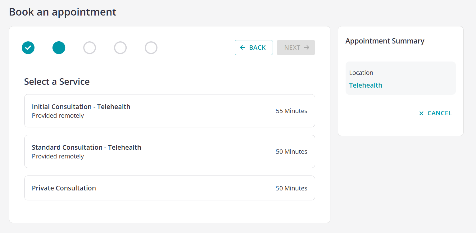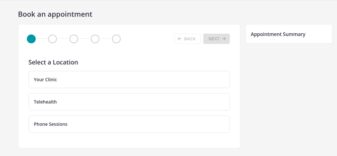 ✅ If you offer services in multiple locations, set them up in Settings > Practice > Locations. See the detailed guide here. For example, you can have different locations for your face to face, telehealth and phone sessions, or different practice buildings. This is how multiple location availability will look on the client portal: