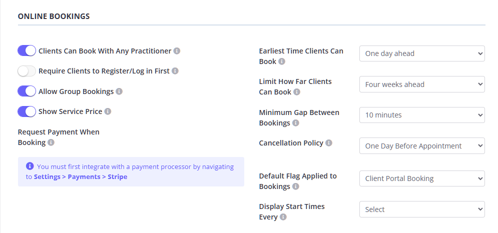- On this page, scroll to the Online Bookings section and go through each setting. You can work on those before you enabled your client portal for clients accessing online bookings.