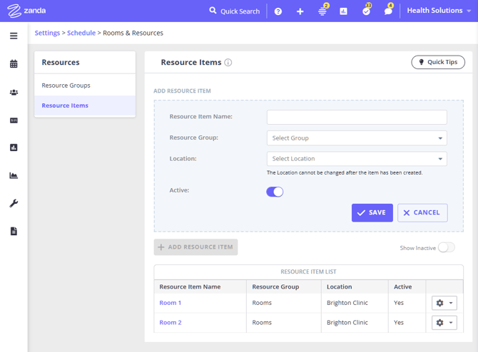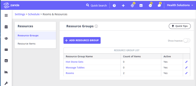 Resources can include rooms, equipment, and any other items that are used for the appointment. When setting up Resources, there are two categories – Resource Groups and Resource Items. Resource Groups are the collection of similar items, such as “Rooms”. Each room would be a Resource Item and would belong to the Room's Group. These may be named such as Room 1 and Room 2 for example, or you may have named them unique to your clinic. This article will cover how to set up Resource Groups and Items, and give more information about how they operate.