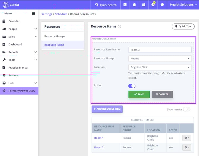 - Enter a unique name for the Resource Item, e.g. Room 1.