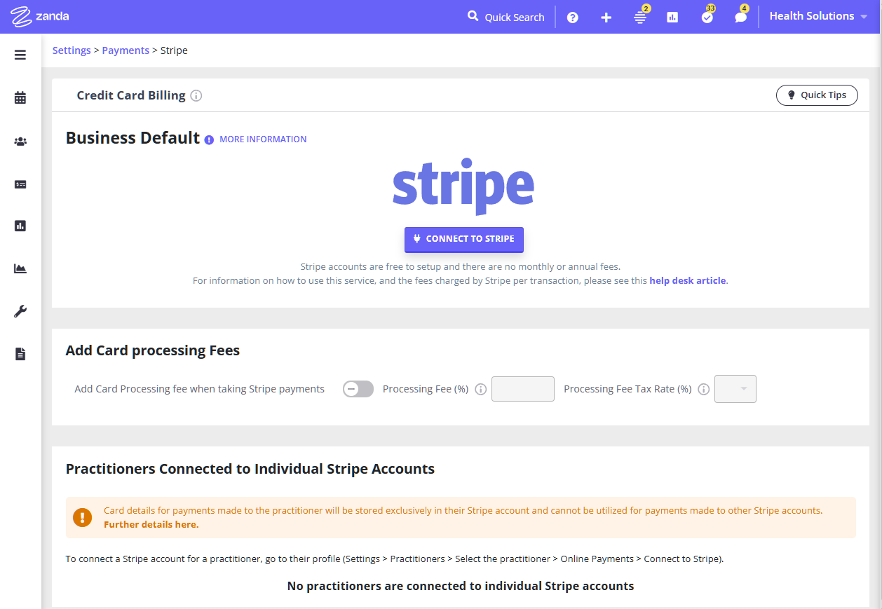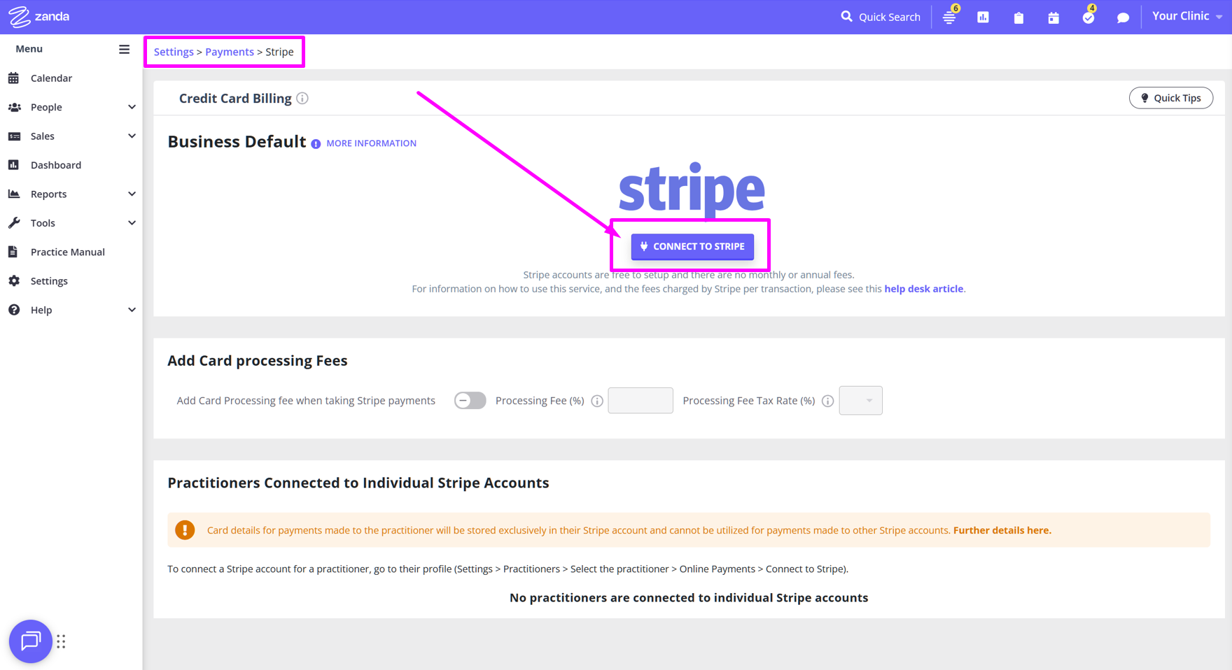 The steps listed below are to connect your Zanda account with a default Stripe account that all practitioners can use. If you're needing to connect separate Stripe accounts for each practitioner in your account, please refer to our Knowledge Base article here going into more detail on that process: Managing Multiple Stripe Accounts in One Zanda Account.