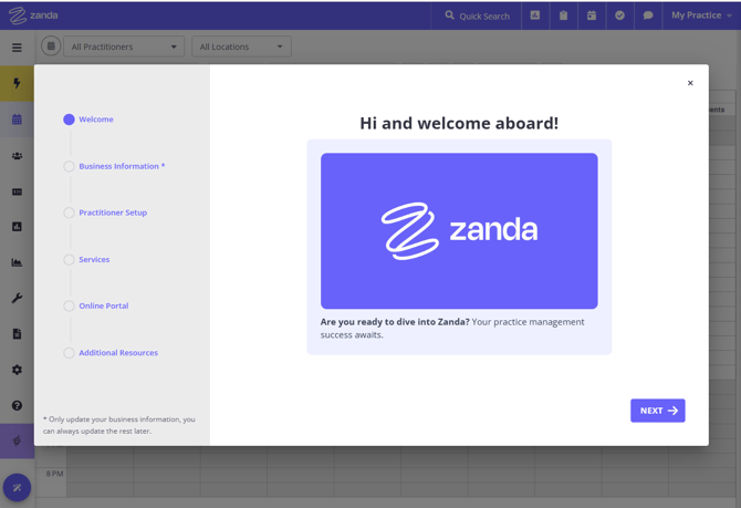 - The Setup Wizard will guide you through setting up the practitioner information, services for billing, online portal for 24/7 appointment bookings, and provide an overview of additional resources.