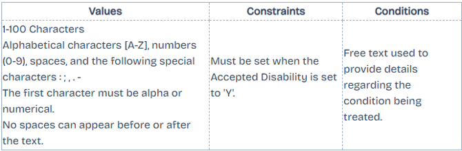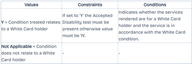 Set this to Y if the patient is a DVA White Card holder. If you set this to Y then you also have to fill out the Accepted Disability text field below which is used to describe the condition that was treated during the session being claimed.
