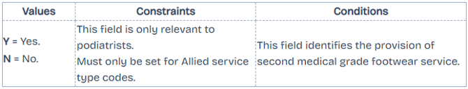 Only applicable for DVA Allied Health claims. This field identifies the provision of second medical grade footwear service.
