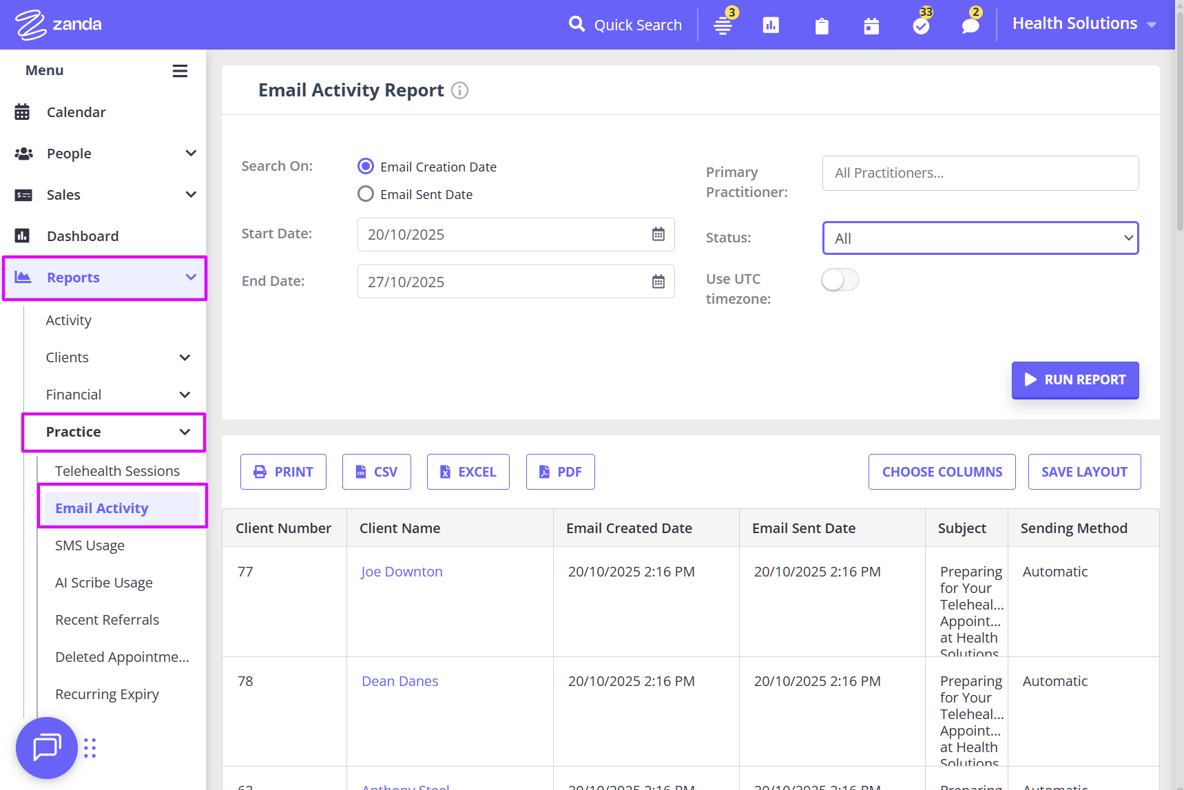 - Includes client number, client name, email created date, email sent date, subject, sending method, type, and status.