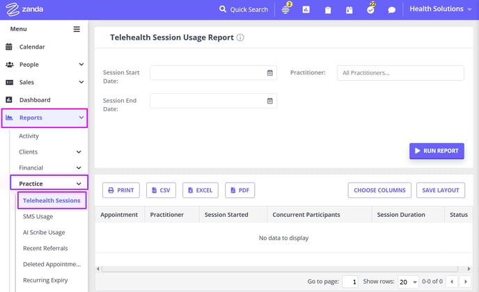 - Provides a list of the Telehealth Sessions that were conducted within the selected time frame by selected practitioner(s);
