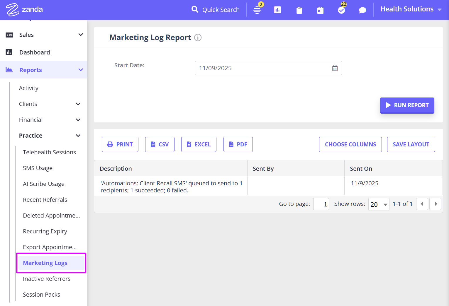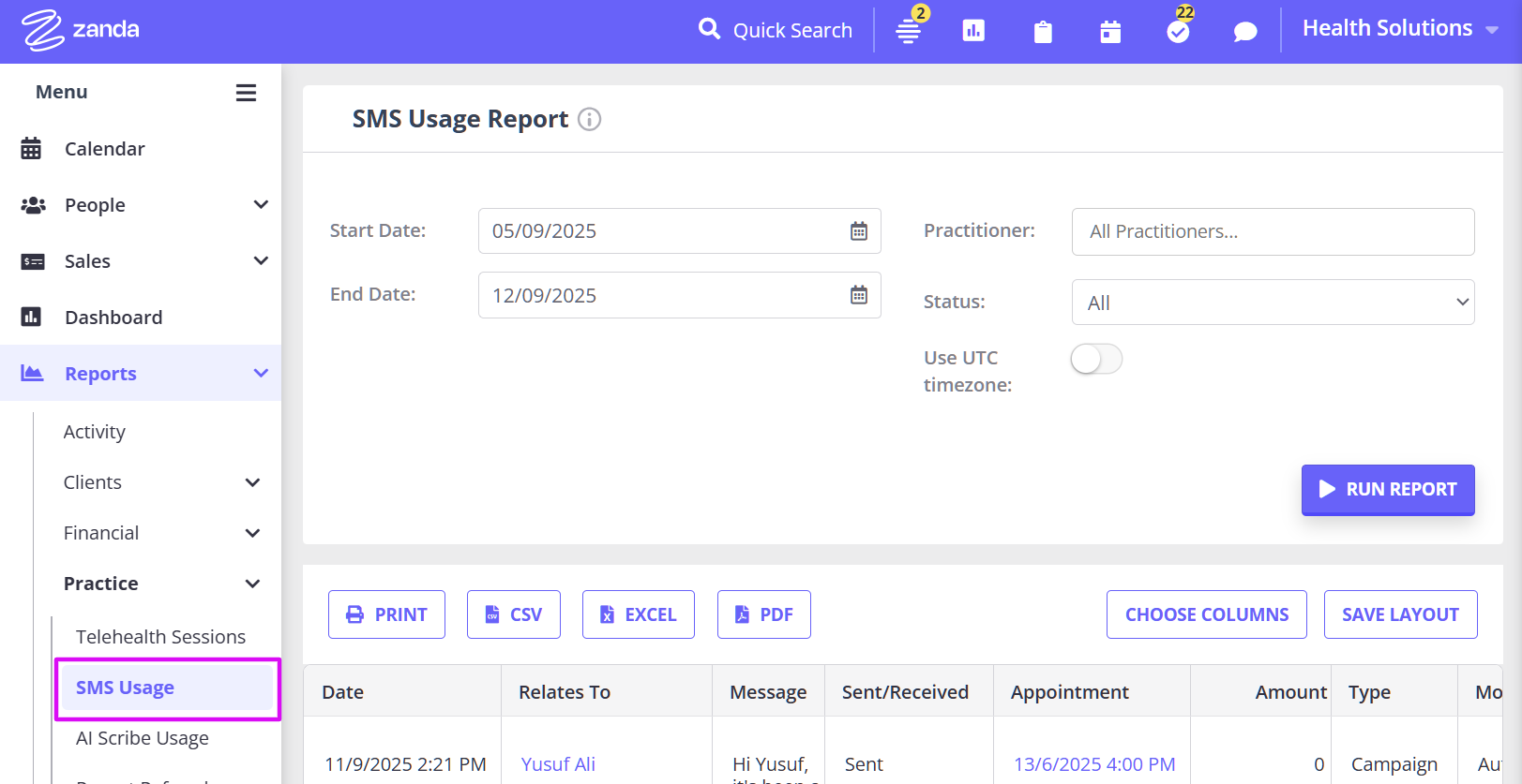 - Use this report to view all SMS sent in the period.