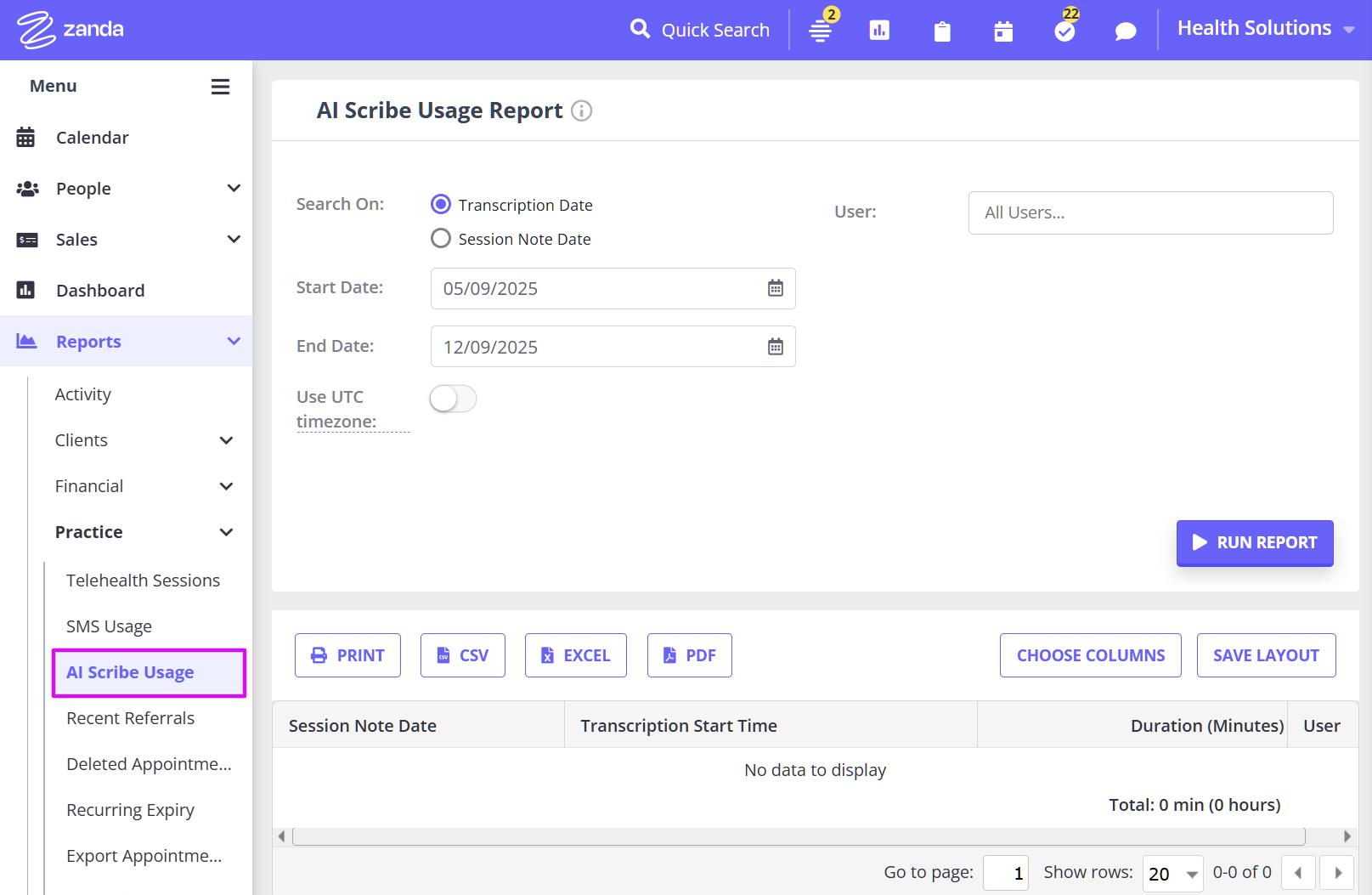 The AI Scribe Usage Report helps you monitor how transcription is being used across your account. It shows the total transcription time per user for a selected date range, making it easier to track usage and manage your billing.