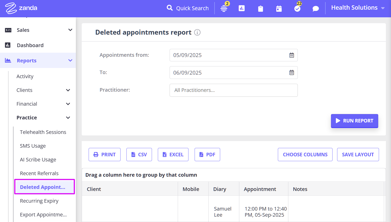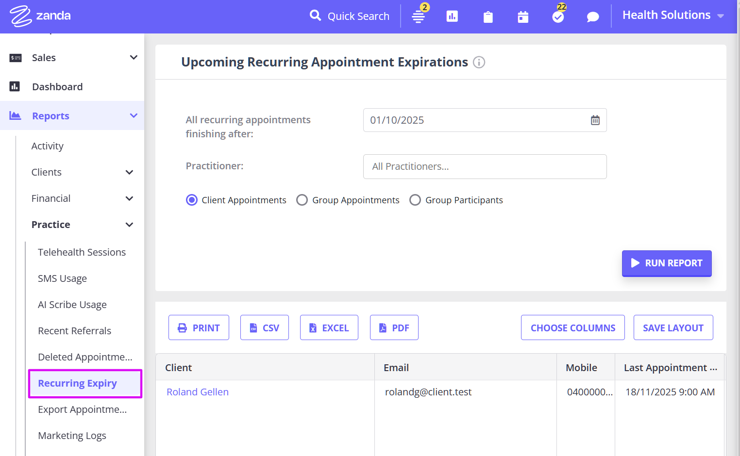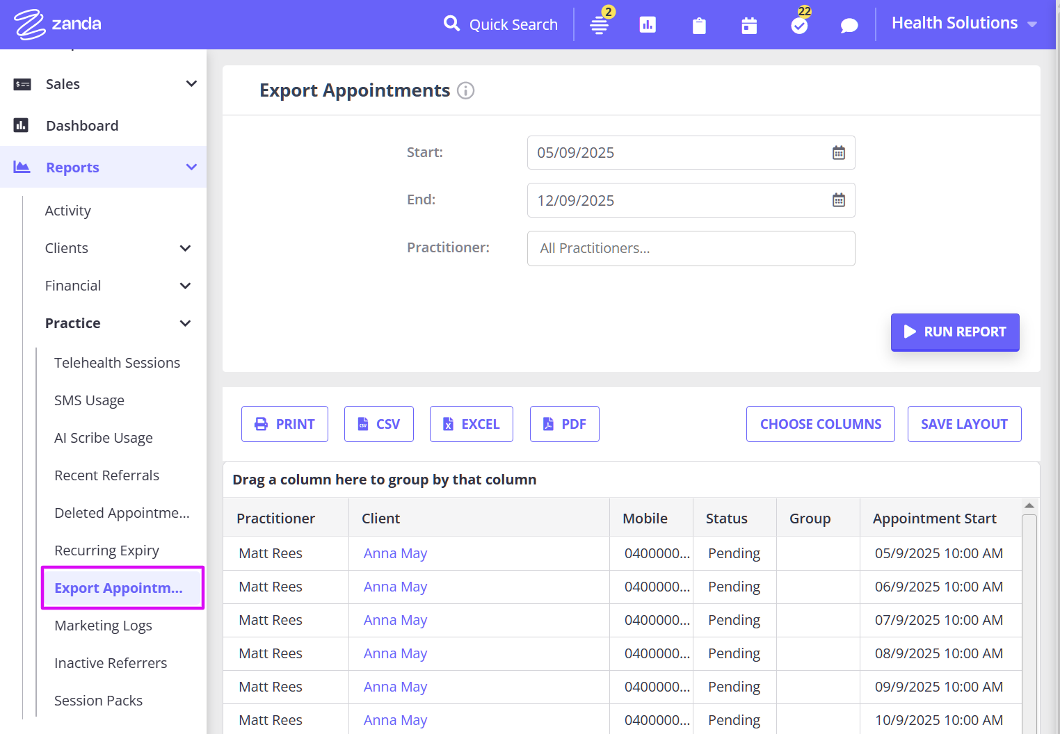 - Generate a list of client, group and personal appointments for a period which can then be exported into a CSV file.