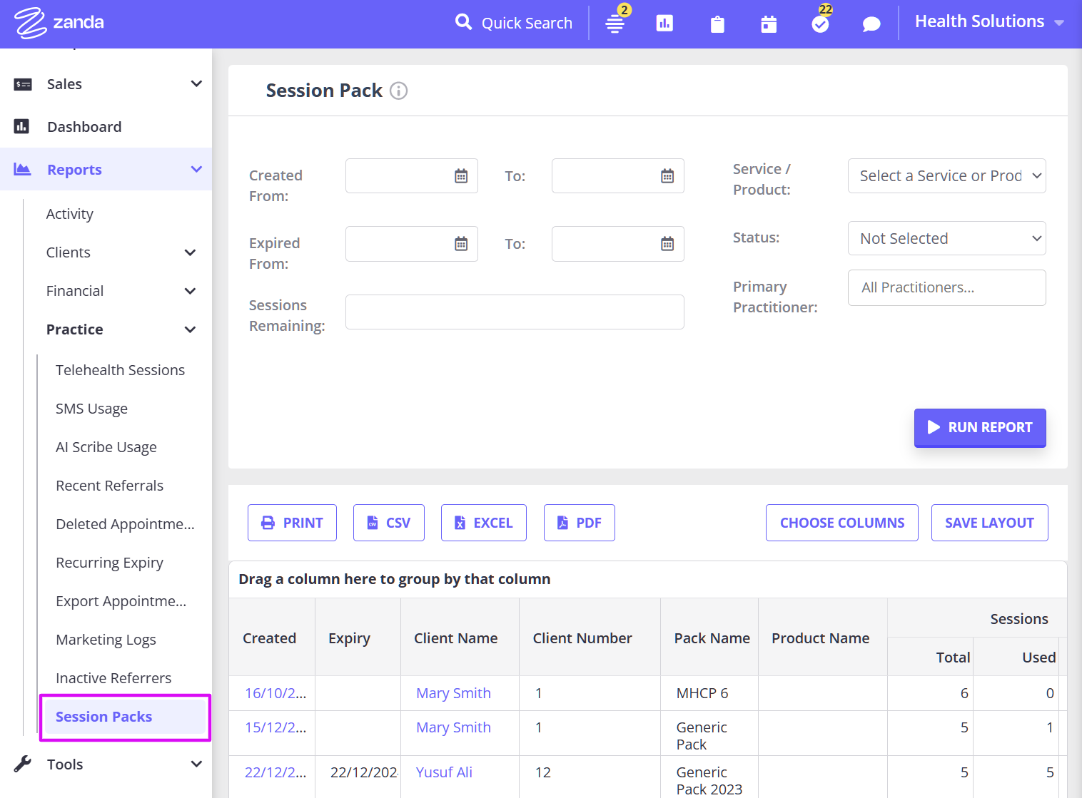 - A report on session packs that can be used to show all packs created or filtered to show packs created within a period, expiring within a period, or packs that have a set number of sessions remaining.