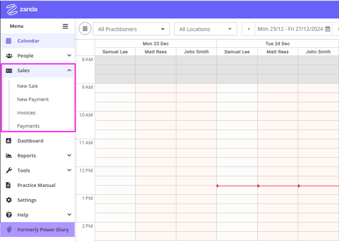 The Sales Menu feature in Zanda is a dashboard allowing users to record new sales and new payments, and generate reports of recorded payments and invoices based on multiple criteria.