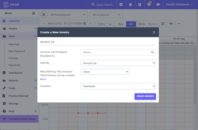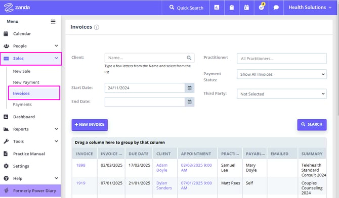 The Sales > Invoices feature will help you generate a list of invoices, based on client name, invoice date, provider's calendar, invoice payment status and third party payee. You can also create a new invoice that is not linked with an appointment.