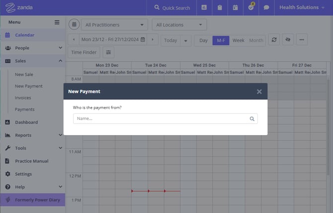 The Sales > New Payment menu allows you to quickly make a record of a payment you are processing for the client or other payees.