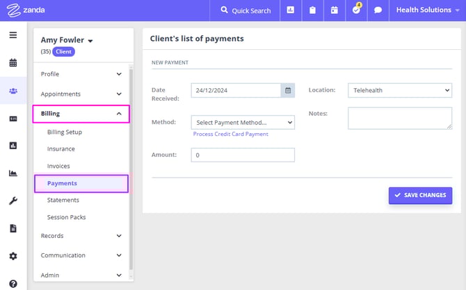 - The Client Profile > Billing > Payments > New Payment page will open;