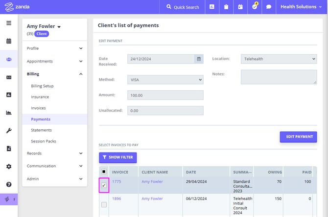 - A list of unpaid client invoices will open below the payment details. Select any invoices that you will pay with this amount, and save the changes.