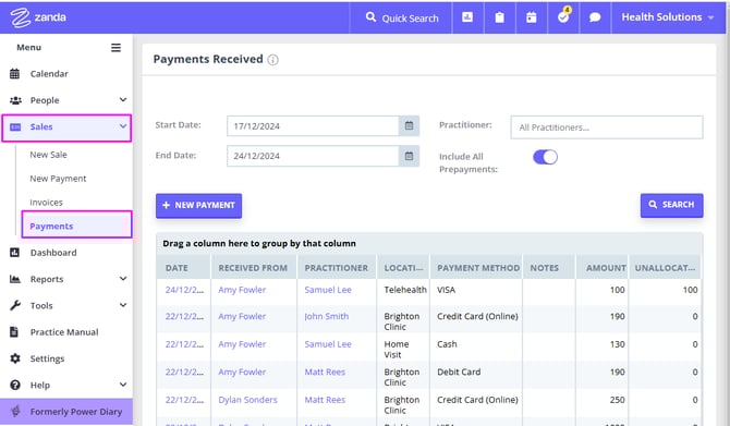 The Sales > Payments feature will help you generate a list of payments, based on payments date and provider's calendar, and include or exclude prepayments. You can also create a new payment on this page.