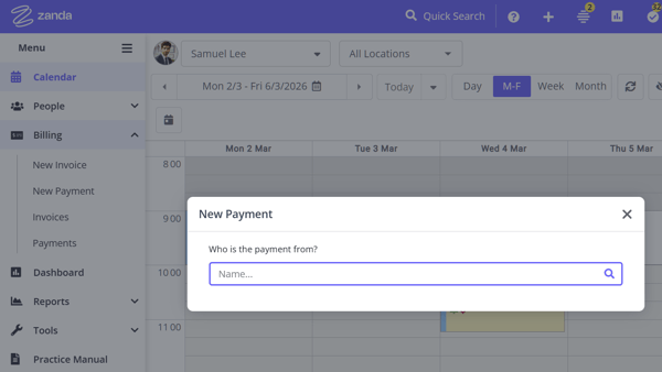 The Billing > New Payment menu allows you to quickly make a record of a payment you are processing for the client or other payees.