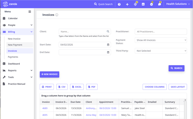 The Billing > Invoices feature will help you generate a list of invoices, based on client name, invoice date, provider's calendar, invoice payment status and third party payee. You can also create a new invoice that is not linked with an appointment.