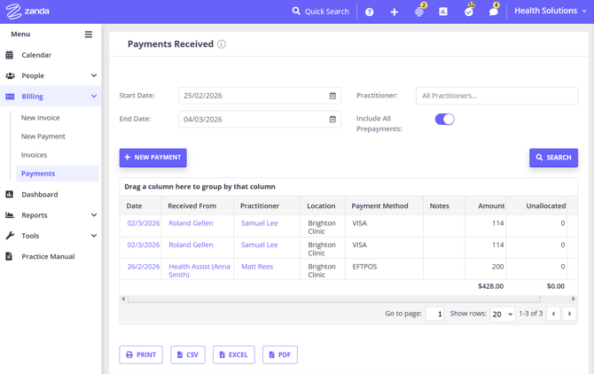 - The generated report will include the following columns with data: date of payment, received from (payee), provider's calendar, location, payment method, payment notes, amount paid, amount unallocated, and actions menu to edit or delete a payment.