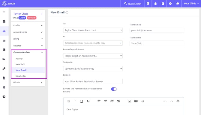 Zanda enables you to send emails and SMS to your clients, as well as letters to clients and GPs and will keep records of such communication.