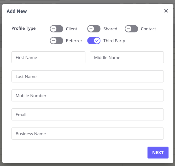 💡 Note: The Client Profile Number (the number shown in brackets next to the profile name) is system-wide and sequential across all profile types. Adding a third party profile increments this counter just like adding a client would.