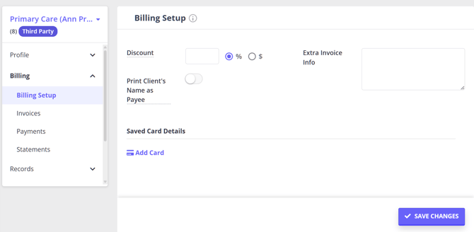 Within a third party profile, navigate to Billing > Billing Setup to configure invoice settings that apply automatically to all invoices billed to this third party.