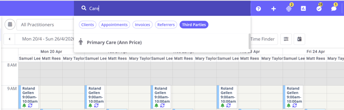 You can find a third party profile using the Quick Search bar at the top of your Zanda dashboard. Type the third party's name or business name and select their profile from the search results.