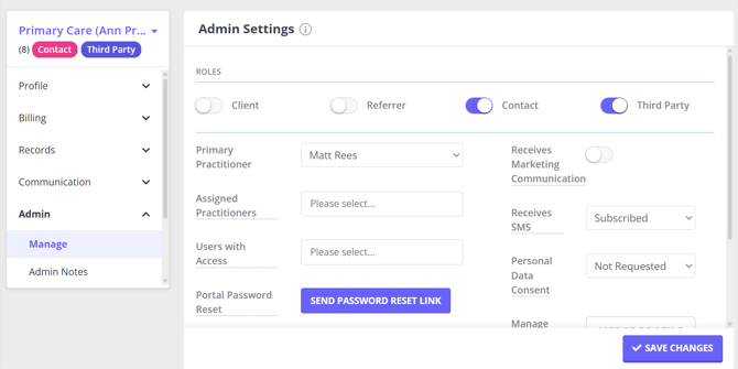A single profile in Zanda can hold multiple roles at once. For example, a third party profile can also be enabled as a Contact, allowing it to appear in a client's contact list and receive appointment reminders on the client's behalf.