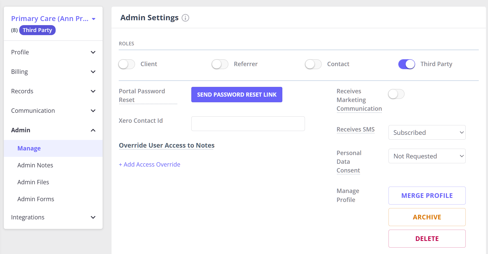 - Open the third party profile and navigate to Admin > Manage.