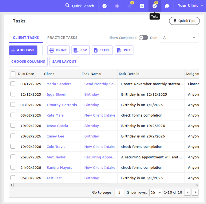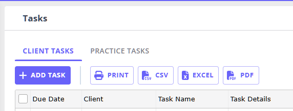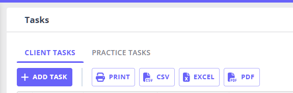 New Client Tasks and Practice Tasks tabs to separate client-related work from internal to-dos