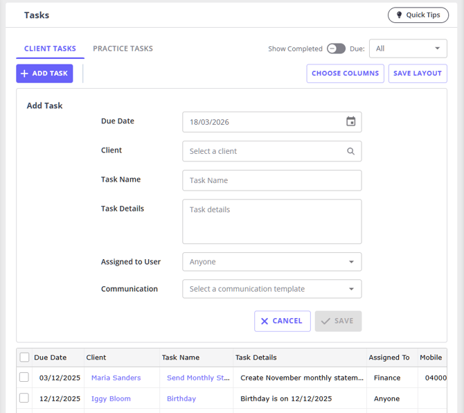 A refreshed Tasks page (previously Client Tasks), with a clearer and more flexible layout