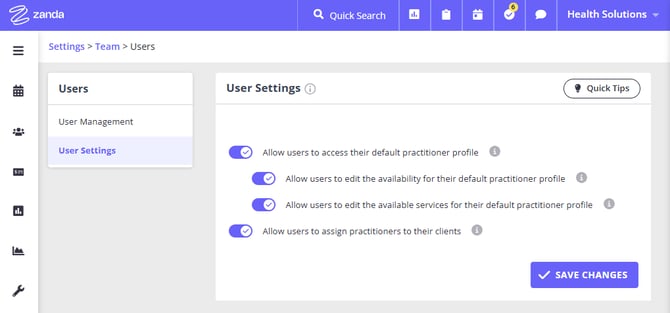 Your practitioners can be allowed to have easy access to their own default practitioner profiles. This will allow them to set their own details, insurer information, sync their Zanda calendar with their google or Outlook calendars, add and edit their availability and services, and connect to their own Stripe account, when permitted.