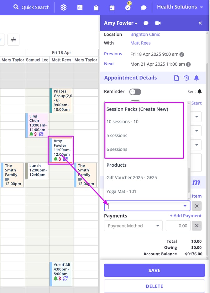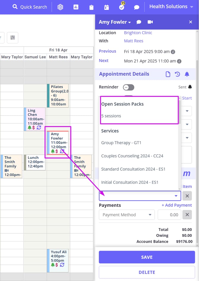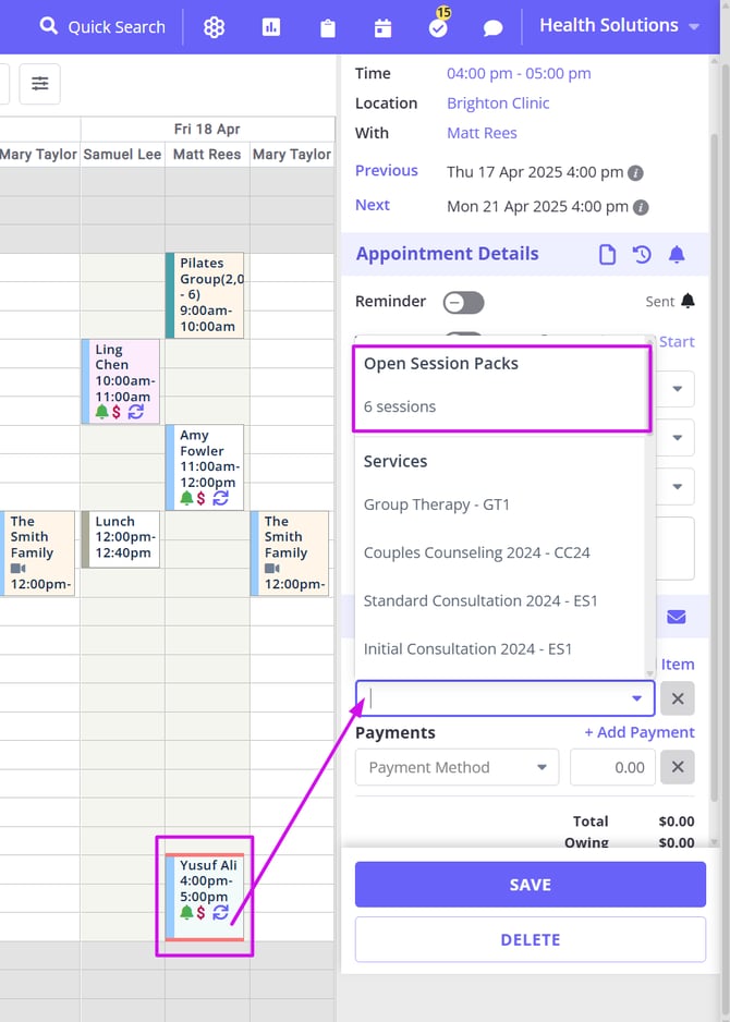 You can assign a new Session Pack to a client through their already-created appointment in your Zanda calendar. Use this method when