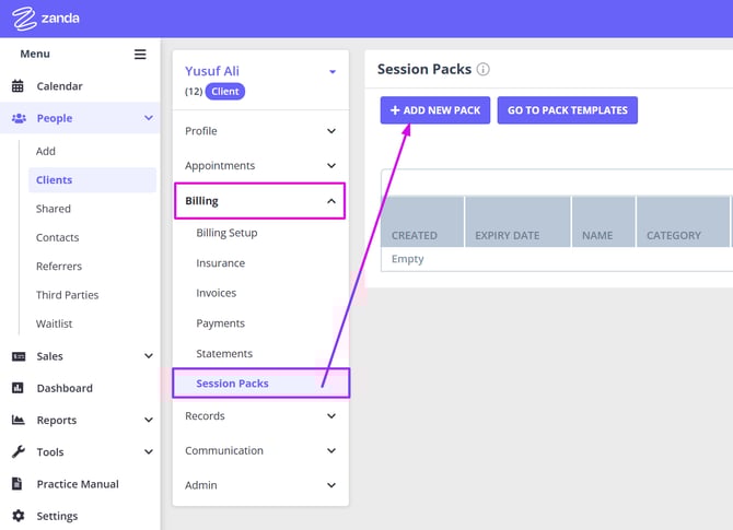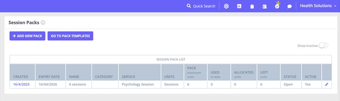 7. Once done, you can easily see all active session packs for the client by navigating to Billing > Session Packs.