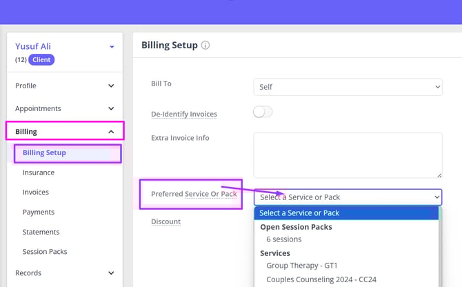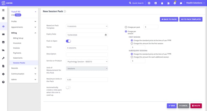 Using this method you will create a session pack for this client and have it ready to be applied to their first appointment with you. Follow the below steps to create the pack: