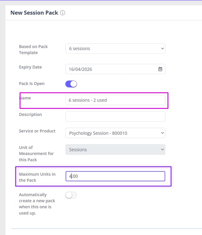 5. Fill in the details of the Session Pack you are assigning the client including name, description, and what metric you'd like to track (number of sessions, hours or money).