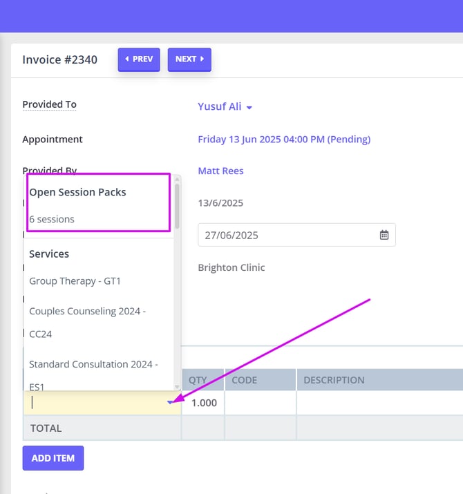 5. Click on Add Invoice Item and select an Open Session Pack or a Session Pack Template from the list.