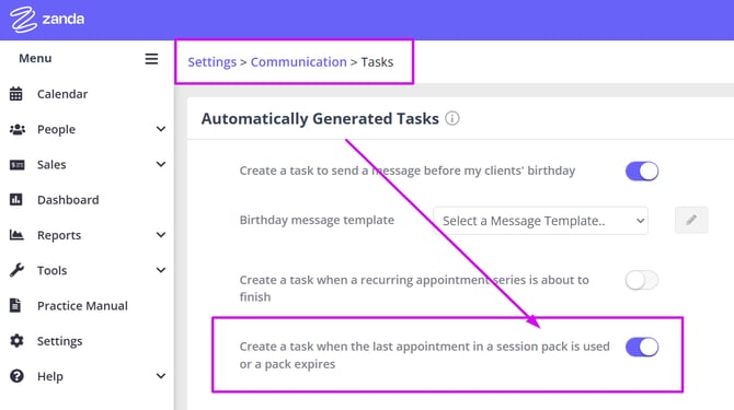 2. Enable the toggle labeled Create a task when the last appointment in a session pack is used or a pack expires