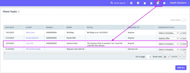 4. When the last session/unit in the session pack is allocated to the client, the Task will be generated to notify you of that.