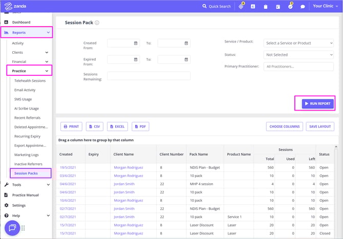 - A report on session packs that can be used to show all packs created or filtered to show packs created within a period, expiring within a period, or packs that have a set number of sessions remaining.