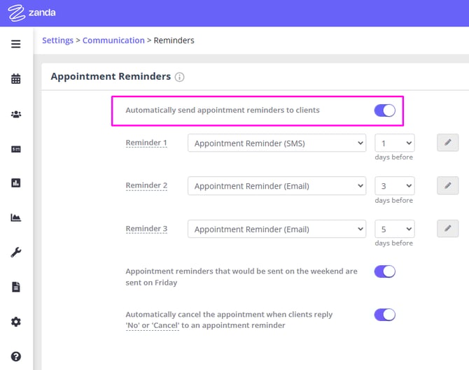 - To check if the automatic appointment reminders are turned on or off, please navigate to Settings > Communication > Reminders. On that page, the top-left toggle 'Automatically send appointment reminders to clients' controls the automatic reminders, both SMS and email.