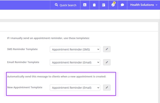 - On the same page, under Settings > Communication > Reminders, you have the option to configure a template that will be automatically sent whenever a new appointment is manually created by an account user. This notification template will remain active even if you choose to disable the automatic reminders toggle located at the top-left of the page.