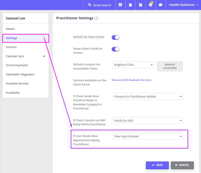 - 'If User Books New Appointment Notify Practitioner' setting will allow a practitioner to stay on top of all new bookings.