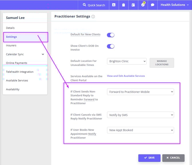 - On the same page, you can define how the practitioner can be notified if a client cancels via SMS.