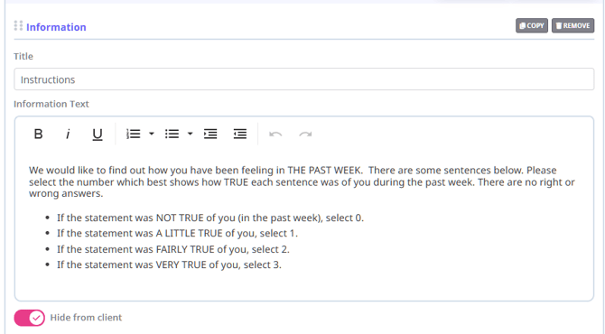 The Hide from client option lets you include internal notes or guidance on a form that only your team can see when viewing completed forms in the client profile. These fields are hidden from clients when they complete the form and are also excluded from print/PDF copies.