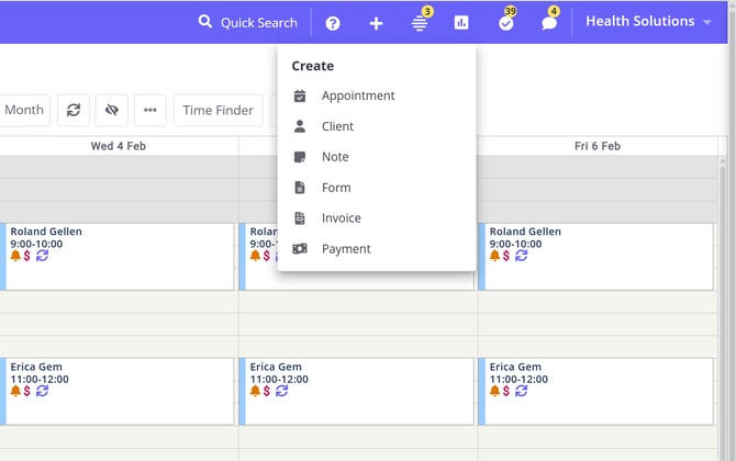 The Quick Actions menu (accessed via the ➕ icon at the top panel) allows you to perform common actions—like creating appointments, adding clients, or starting session notes—without navigating away from your current work.