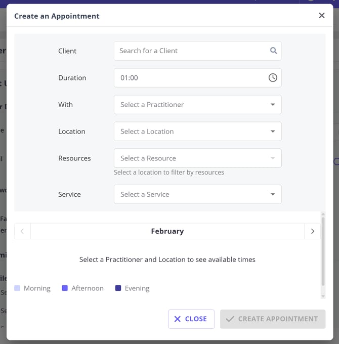 The Create an Appointment modal allows you to book an appointment without leaving your current page.